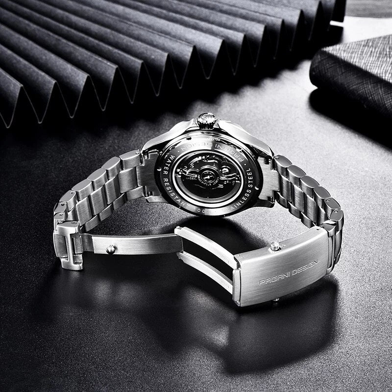 Cristal de Zafiro, Movimiento Japonés NH35 con 42 horas de reserva de marcha, Bisel de Cerámica y Acero Inoxidable 316L (quirúrgico). Resistencia al agua 100M/10BAR.