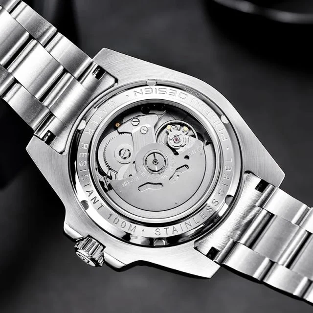 Movimiento automático Japonés Miyota 8215 con 41 horas de reserva de marcha. Acabado en acero inoxidable 316L.